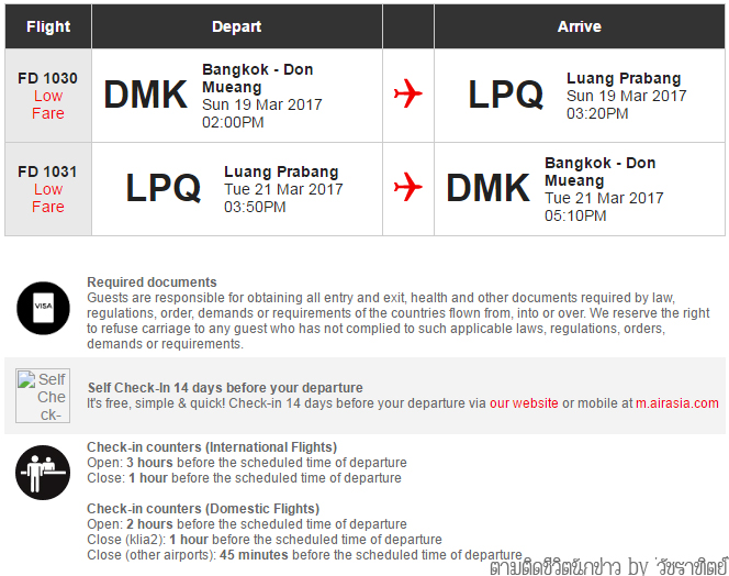 เช้าของวันที่ 19 มีนาคม 60 ผมเดินทางมายังสนามบินดอนเมืองแต่เช้า เพื่อมารอขึ้นเครื่องของ Air Asia ผมเดินชิลลงจาก Shuttle bus สาย A1 ที่มาจอดทิ้งผมลงหน้า Terminal 1 อาคารผู้โดยสารระหว่างประเทศ ที่ช่วงเช้านี่นรกแตกสุดๆ คนเยอะแยะตะแป๊ะสิ่ง อย่างกับขนส่งหมอชิต แต่ด้วยความเคยชินของผม ก็จะทำการเช็คอินตั๋วผ่านอินเตอร์เน็ตมาแล้ว เพื่อกันตัวเองมาสาย (เพราะผมมีประวัติตกเครื่องบ่อยมากกกก 5555) ผมเดินมาที่เค้าเตอร์เช็คอินด้วยความมั่นใจ เพราะจำได้ว่า เครื่องบินออกตอน 10:30 น. แน่นอน แต่พอมาถึงปุ๊ป บอกเช็คอินตั๋วไปหลวงพระบาง พนักงานก็ทำหน้างงๆ ใส่ผม แล้วถามย้อนกลัวว่า