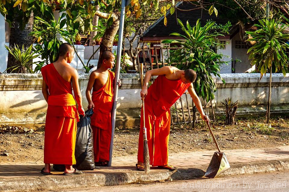 เดินเก็บบรรยากาศชานเมืองหลวงพระบางยามเย็นไปเรื่อยๆ พระ เณร เริ่มกำลังกวาดลานวัด และเตรียมใกล้เวลาสวดมนต์ทำวัดเย็น