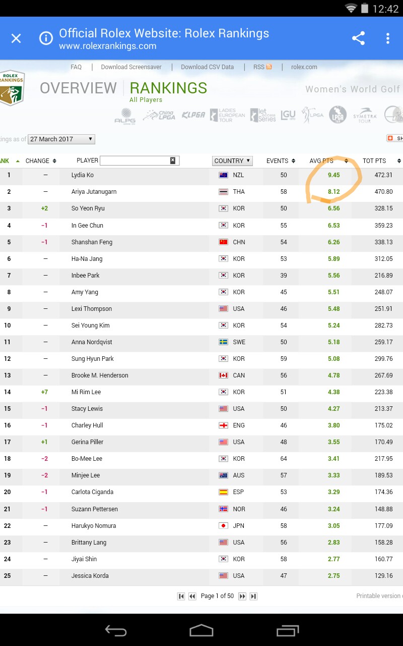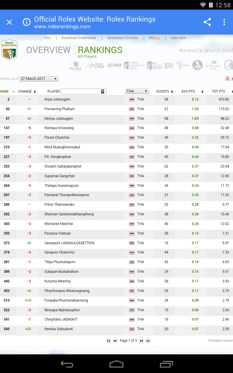 ROLEX WORLD RANKINGS ล่าสุด 27 MAR 2017