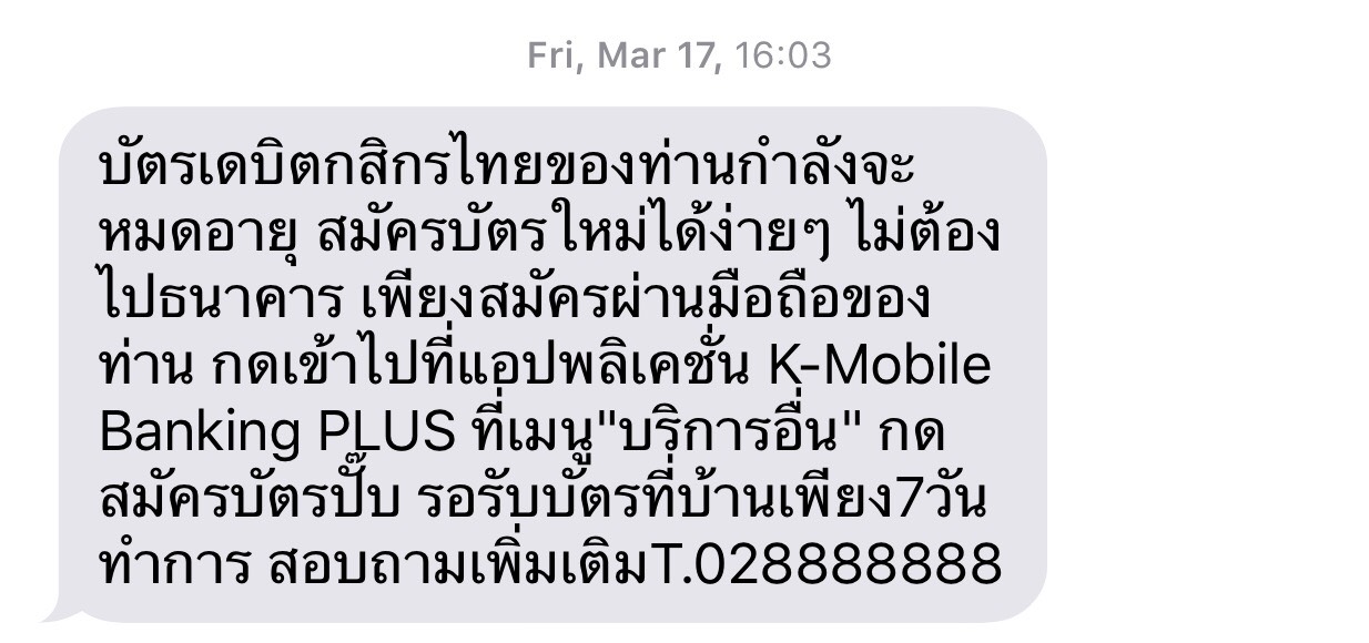 สืบเนื่องมาจากมี Sms แจ้งเข้ามาทางโทรศัพท์ว่า บัตรเดบิต ของผมกำลังจะหมดอายุการใช้งาน ตามภาพ ผมจึงไปสมัครใหม่ตามช่องทางที่ระบบได้แนะนำ