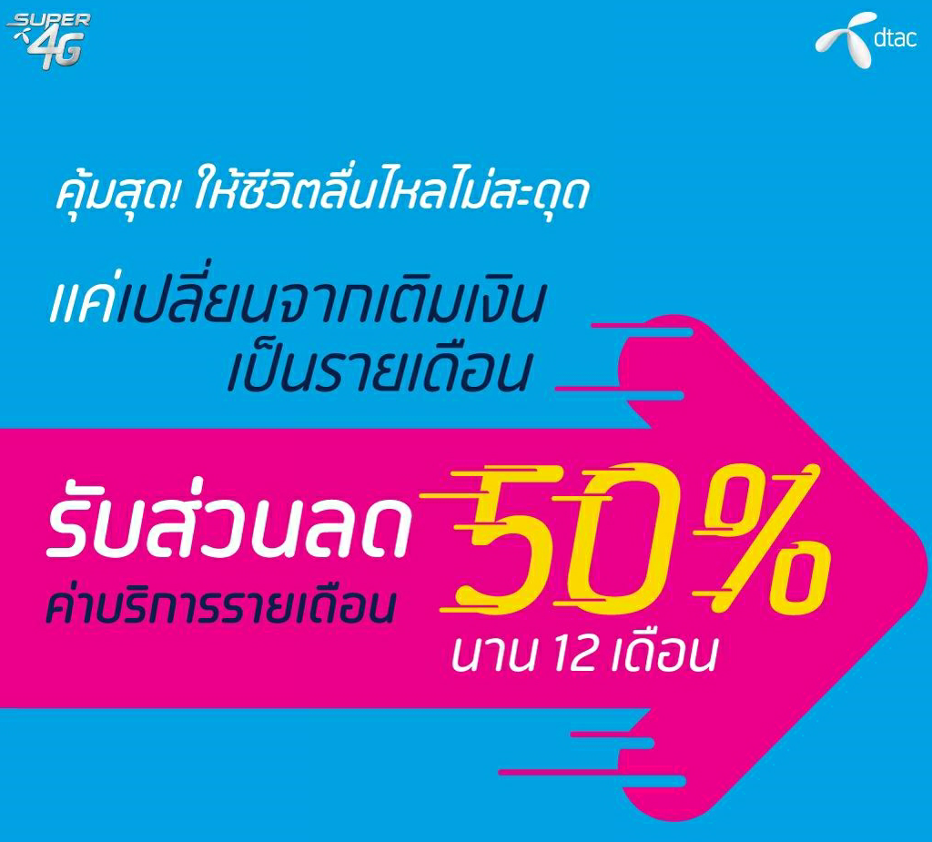 เติมเงินเป็นรายเดือนโปรส่วนลด 50% (DTAC)