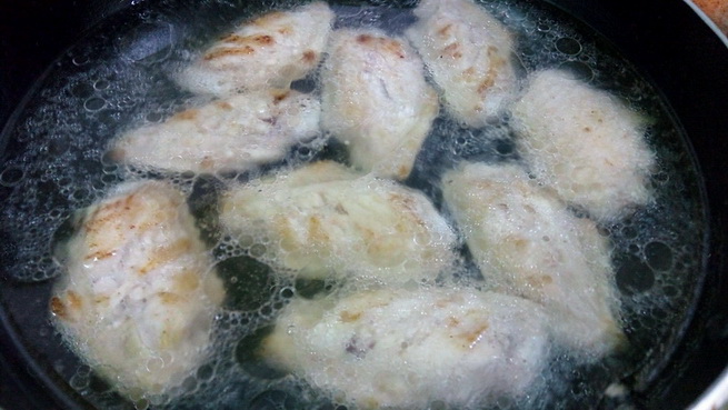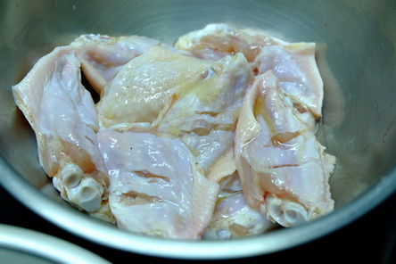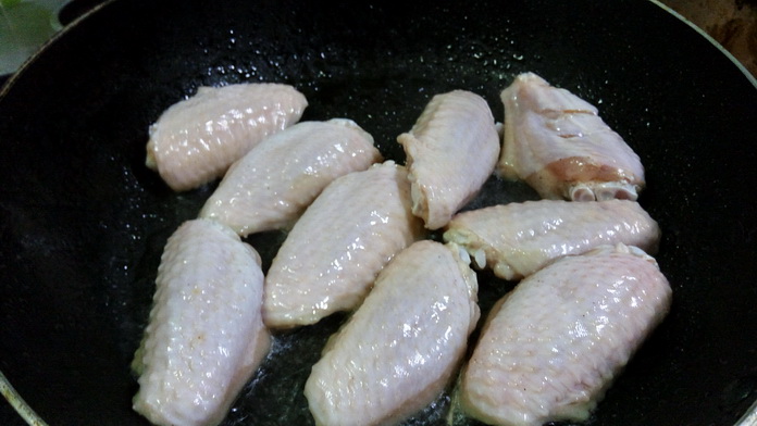 1. เตรียมปีกไก่ไว้ โดยหมักกับเกลือ น้ำตาล และน้ำปลา พริกไทย พักไว้