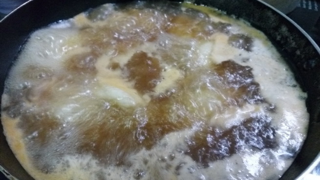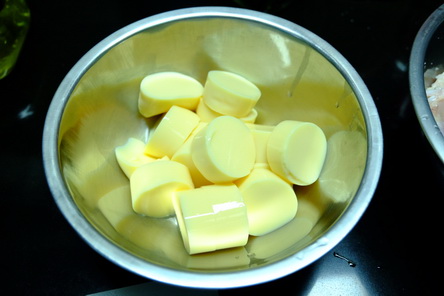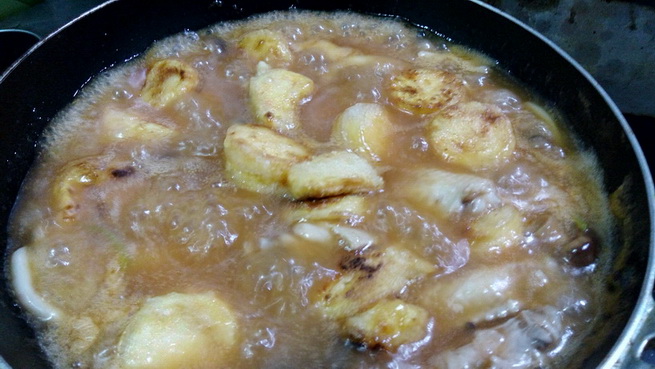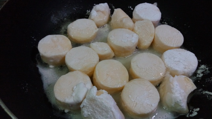 2. หั่นเต้าหู้ และนำไปชุบกับแป้ง และทอด มือเบาๆ นิดนึงนะครับ เดี๋ยวเต้าหู้แตกเสียทรงหมด ตรงไหนดำๆ ก็ตัดทิ้งนะครับ