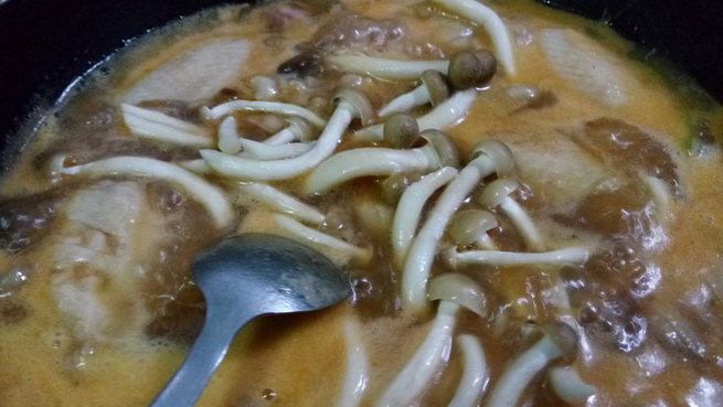 6. ใกล้ๆ ก็เติมเห็ดลงไป แล้วก็ใส่แป้งมันลงไปนิดหน่อยใ้ห้พอหนืดๆ สุดท้ายก็ค่อยใส่เต้าหู้ลงไป คนอีกนิดหน่อย ก็ตามด้วยต้นหอม และเหล้าจีนลงไปได้เลย (ก่อนปิดไฟก็เร่งไฟเต็มที่ แล้วใส่เหล้าจีนไป แป๊บเดียวก็ปิดได้เลย)
