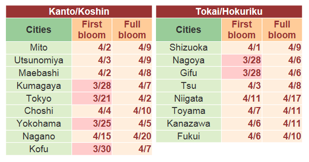 จากพยากรณ์ล่าสุด ดูเหมือนจะบานช้าลงเล็กน้อยค่ะ Mito(Ibaraki) / Utsunomiya(Tochigi) / Maebashi(Gunma) / Kumagaya(Saitama) / Choshi(Chiba) / Yokohama(Kanagawa) /