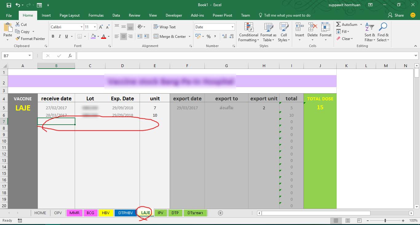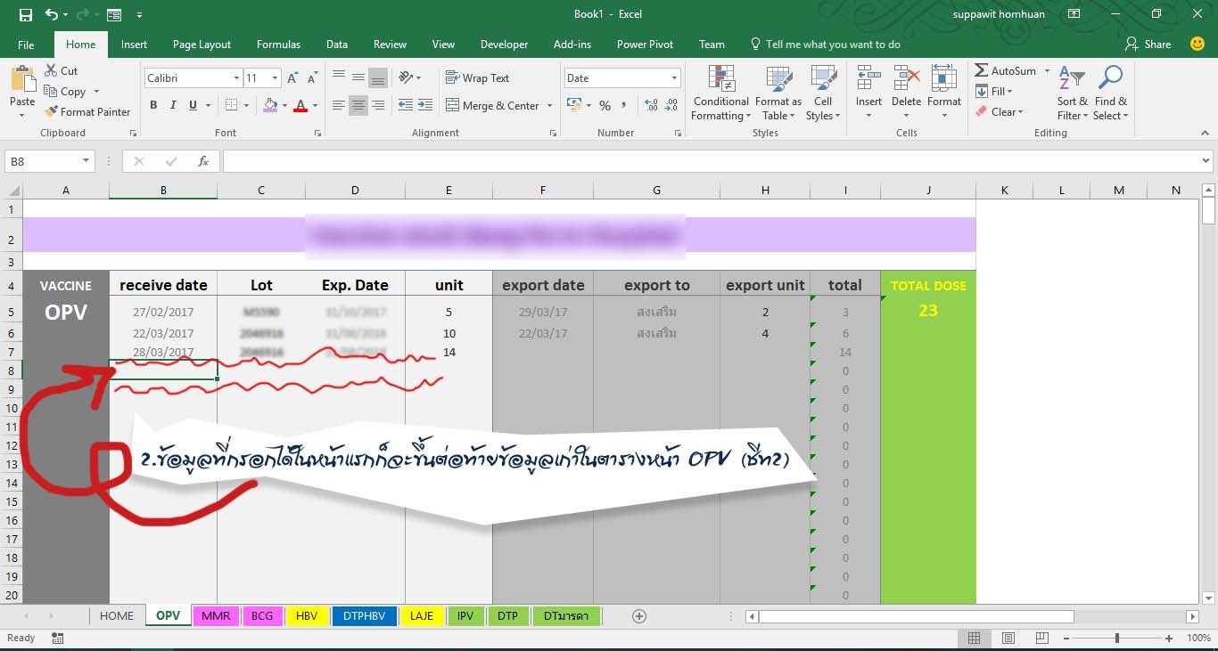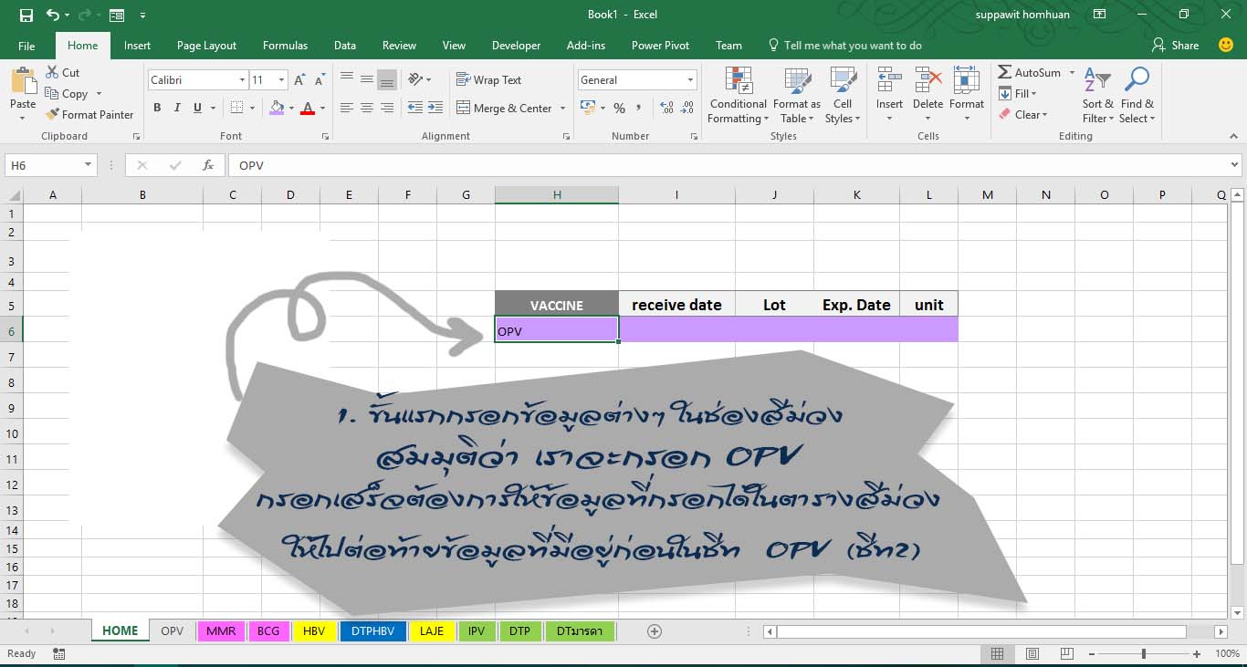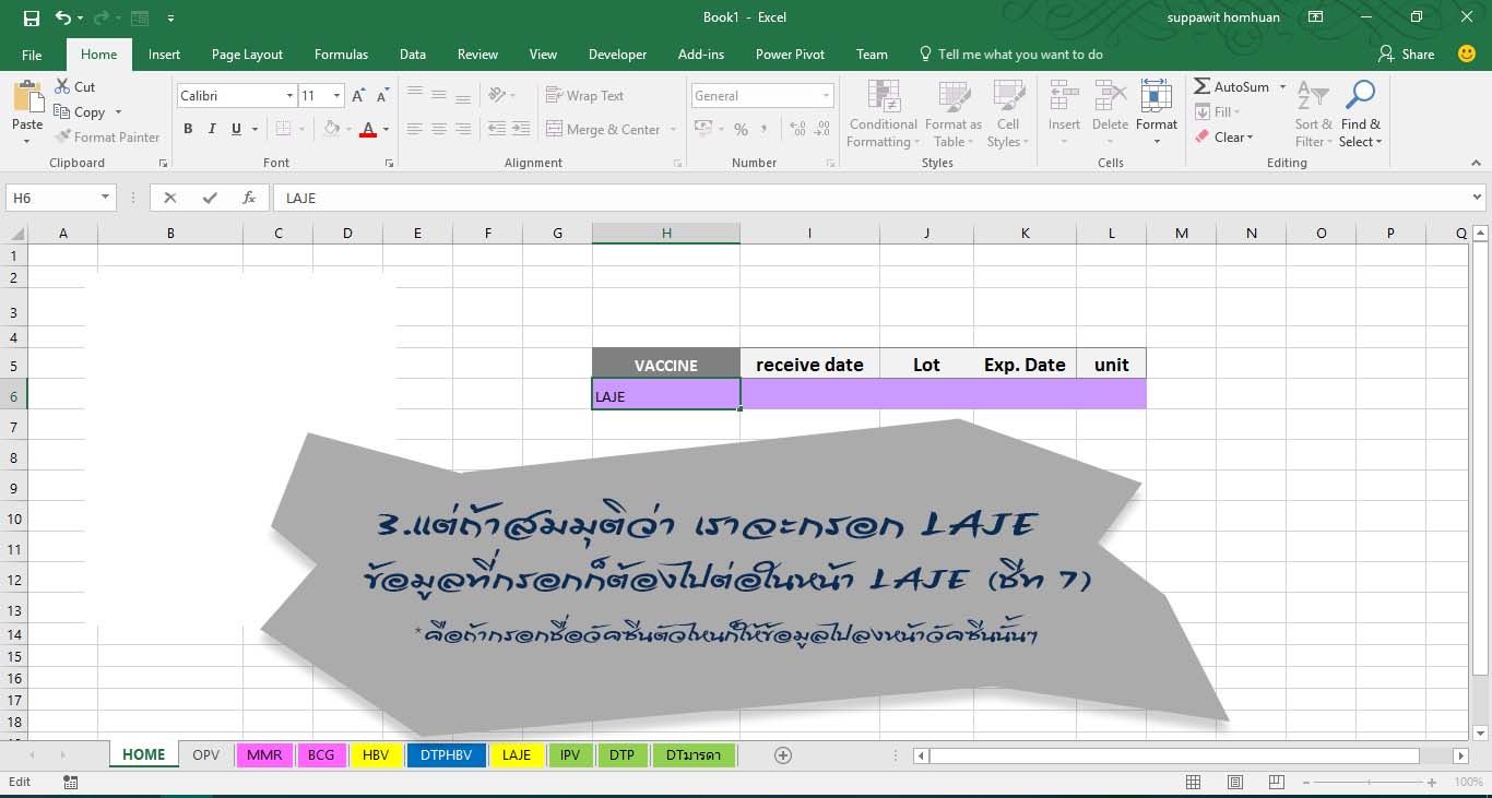 ..จะกรอกข้อมูลวัคซีนจากชีท "HOME" (ชีทแรก) ให้ไปบันทึกต่อท้ายรายการที่มีอยู่แล้วในชีทอื่น(ซึ่งมีหลายชีท) โดยสามารถกำหนดให้ข้อมูลที่กรอกไปขึ้นเฉพาะชีทได้ (วัคซีนตัวไหนก็ไปขึ้นเฉพาะในชีทวัคซีนนั้นๆ) ต้องทำอย่างไรครับ ?