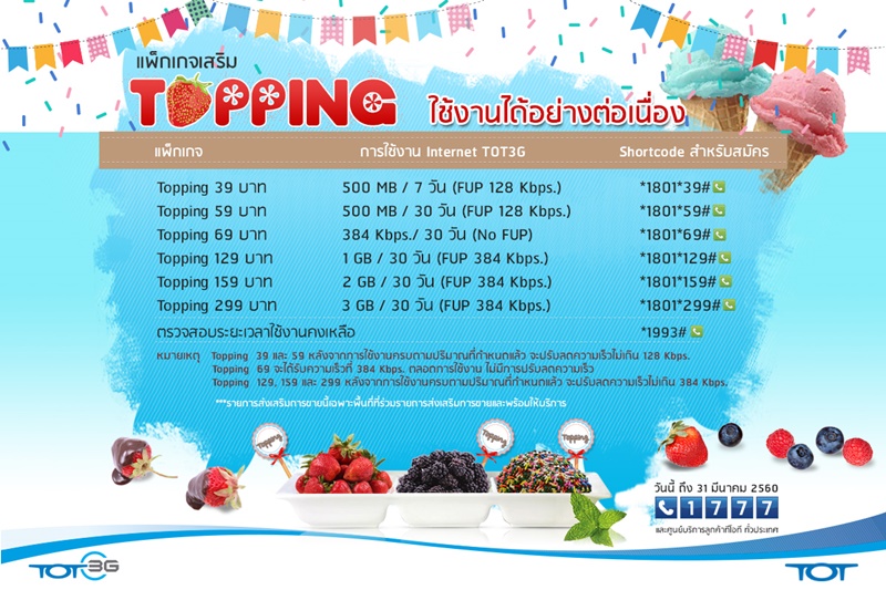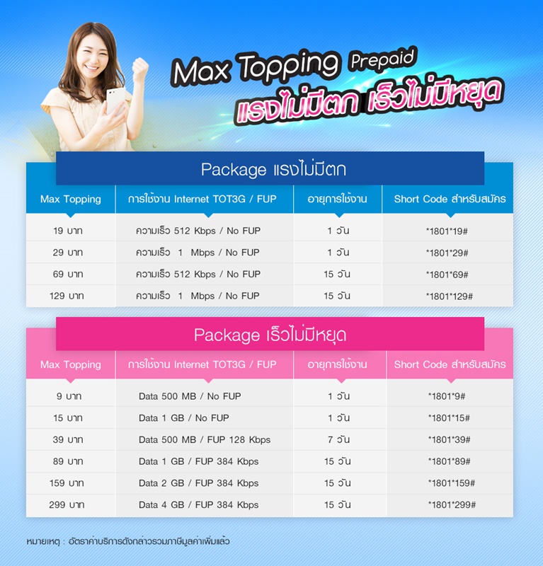 TOT3G ออกแพ็กเกจเน็ตมือถือใหม่ เป็นแพ็กเกจเสริมแบบเติมเงินชื่อว่า Max Topping Prepaid เน้นให้เล่นเน็ตด้วยความเร็วคงที่แบบไม่จำกัดปริมาณ ไม่ติด FUP ด้วยความเร็วเริ่มต้นที่ 69 บาท ใช้งานได้นาน 15 วัน หร