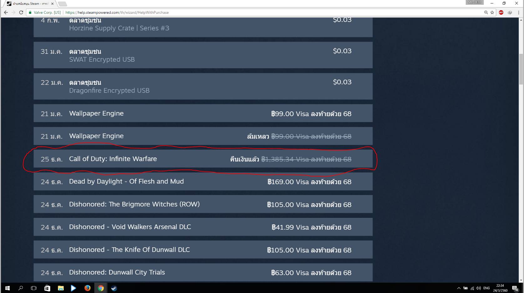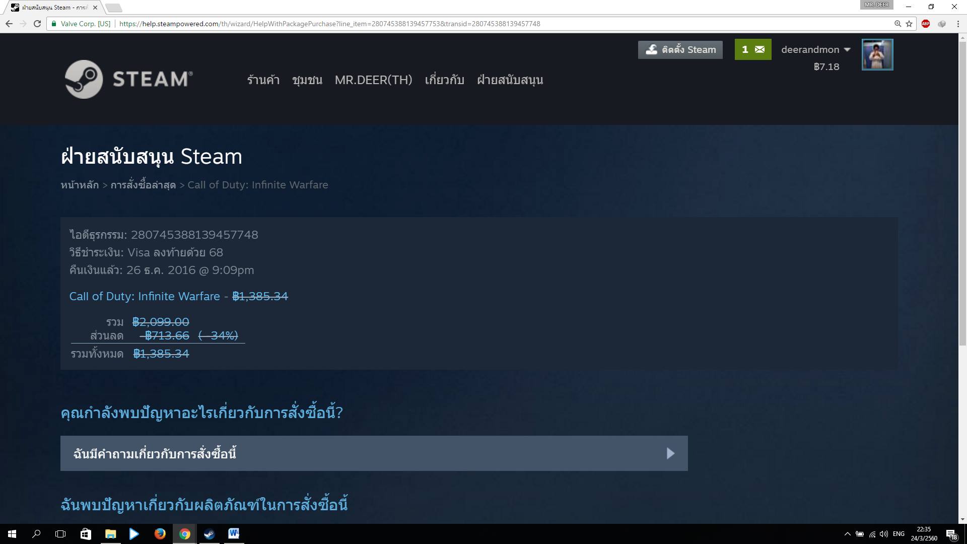ขอขอบคุณที่ติดต่อฝ่ายสนับสนุนระบบไอน้ำคำขอเงินคืนสำหรับ Call of Duty: Infinite Warfare ได้รับการอนุมัติก่อนที่การประมวลผลของคุณจะเสร็จสิ้นสมบูรณ์ดังนั้นการทำรายการเดิมจึงถูกยกเลิก Steam ไม่ได้เรียกเก็บเงินจากคุณสำหรับการซื้อนี้