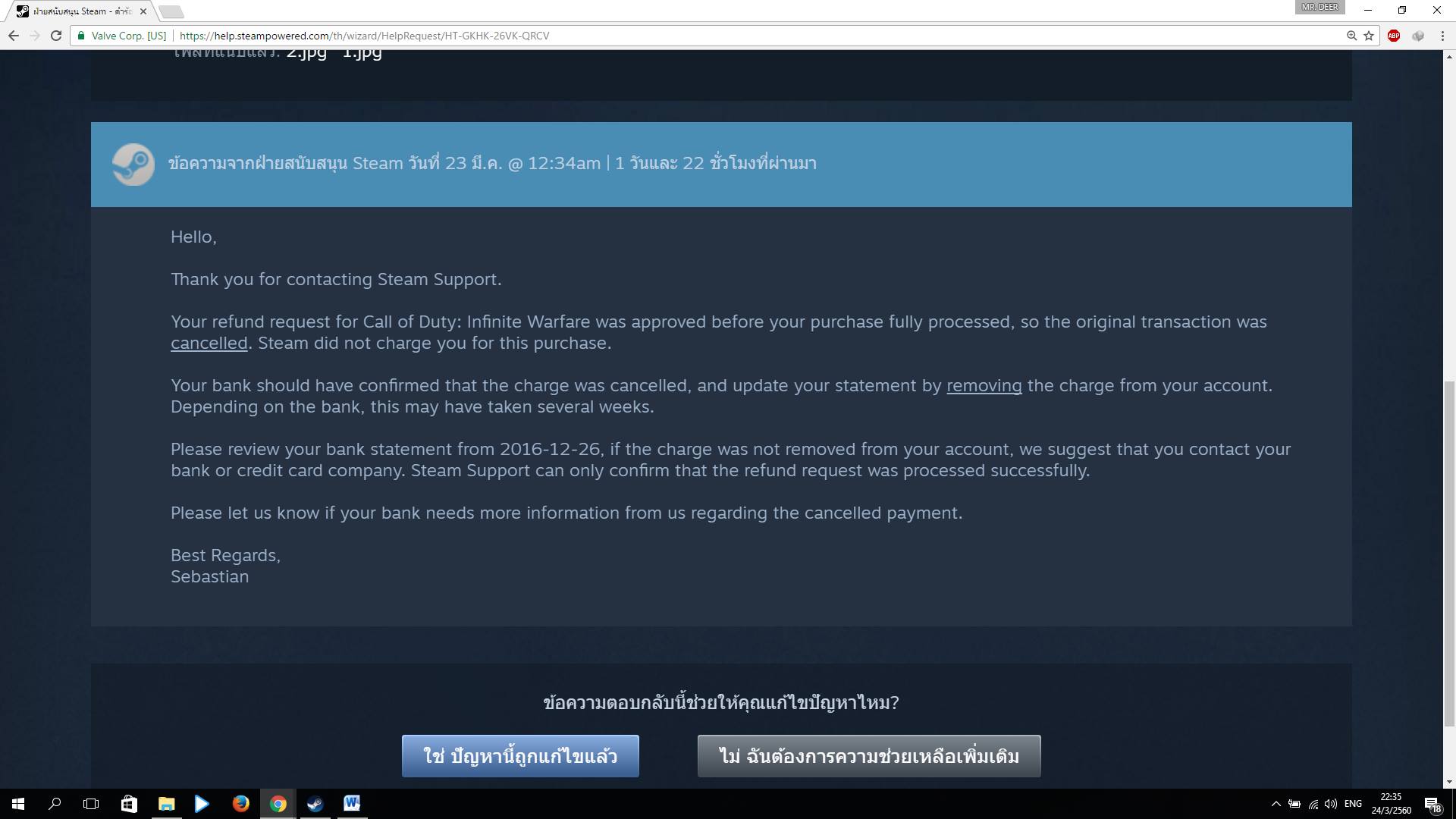 โปรดอ่านใบแจ้งยอดธนาคารของคุณตั้งแต่ 2016-12-26 ถ้าการเรียกเก็บเงินไม่ได้ถูกนำออกจากบัญชีของคุณเราขอแนะนำให้คุณติดต่อธนาคารหรือ บริษัท บัตรเครดิตของคุณ การสนับสนุน Steam สามารถยืนยันได้ว่าคำขอเงินคืนได้รับการประมวลผลเรียบร้อยแล้ว