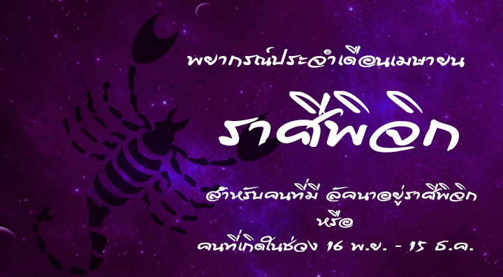 วายชีวี ธรณีจะสูบกินซึ่งเลือดคน” ต้องระมัดระวังการใช้ชีวิตอย่างไประมาท จะเกิดอุบัติเหตุรุนแรง โดนทำร้าย ควรหาโอกาสไปทำบุญและอยู่ในศีลจะได้เป็นกำลังบุญให้แคล้วคลาดปลอดภัย ทิศทางการงานดาวอาทิตย์ที่เป็นดาวการงานจะโคจรเป็นอริแก่ดวงชะตาที่ราศีเมษในวันที่ 14 เม.ย. ร่วมดาวมฤตยู ในจุดนี้จะมีปัญหาต้องแก้ไขและเปลี่ยนแปลงอยู่ปลายประการ มีอุปสรรค ด้วยคุณภาพดาวอาทิตย์นั้นมีตำแหน่งเป็นมหาอุจน์ ในส่วนดีจะเป็นเรื่องของงานที่โดดเด่นแต่จะเป็นงานยากซึ่งถ้าทำได้จะประสบผลสำเร็จอย่างดียิ่งในช่วงปลายเดือนเมษายน ทิศทางการเงินยังคงต้องประคับประคองไปก่อนด้วยดาวพฤหัสบดีที่เป้นดาวการเงินของชาวราศีพิจิกเองก็พักรองศา จะมีเหตุสะดุดไปอยู่บ้างแต่ก็ยังพอได้จากการงานประปราย ในช่วงที่ดาวเสาร์เข้าทับก็จะมีภาระที่หนักเหมือนช่วงที่ผ่านมาให้อดทนไปก่อน ต้องมีวิริยะ อุตสาหะ จึงจะพลิกฟื้นได้ เรื่องของความรัก คนโสดมีเกณฑ์จบความสัมพันธ์ที่เริ่มต้นใหม่ คนที่มีคู่และครอบครัวต้องระวังช่วงนี้ให้ดีจะมีเกณฑ์ทะเลาะกันรุนแรง ถ้าผ่านไม่ได้จบเลยอดทนมาขนาดนี้ต้องประคองกันให้ดี จะเห็นได้ว่าความรักนั้นไค่อยดีให้ใส่ใจกับเรื่องการงานแทนจะดีกว่านะครับ