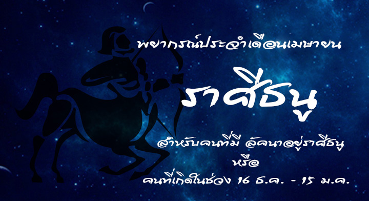 ชาวราศีธนูในช่วงตั้งแต่วันที่ 23 มี.ค. ที่ผ่านมาโดนดาวเสาร์โคจรเข้าทับดวงชะตาซึ่งค่อนข้างน่าเป็นห่วงกันเลยทีเดียวสำหรับคนที่มีครอบครัว และ คนรัก อึดอัดติดขัด มีความกดดันสูง ป่วยเจ็บ มีภาระมากขึ้น “โทษทุกข์ทายเสาร์” ซึ่งควรเรียนรู้จากประสบการณ์ที่ดาวเสาร์เข้าทับดวงชะตาจนถึงวันที่ 18 เม.ย. ดาวเสาร์ถึงจะพ้นจากดวงชะตาและจะกลับมาทับอีกเป็นระยะเวลาร่วม 2 ปีครึ่ง ในวันที่ 1 ธ.ค. นี้ ชาวราศีธนูจึงต้องเตรียมตัวให้ดีนี่เป็นเพียงหนังสั้นที่แสดงให้คุณได้เห็นก่อนที่จะเจออีกในช่วงปลายปี ให้หาโอกาสไปสร้างบุญไว้เป็นกำลังหนุนนำดวงชะตา สำหรับเดือนนี้ทิศทางชีวิตค่อนข้างอึมครึม ด้วยดาวสำคัญหลายดวงนั้นโคจรพักรองศา ให้ระวังการผิดพลาดจากงานให้ดีโดยเฉพาะวันที่ 4 – 24 เม.ย. ดาวพุธที่เป็นดาวการงานพักรองศา ข้อตกลงต่างๆ และ การติดต่อมีปัญหารวมไปถึงเกิดความล่าช้าในช่วงดังกล่าวซึ่งดาวพุธเองก็เป็นดาวคู่ครองเช่นเดียวกันทำให้งานกับคู่นั้นมีปัญหาพร้อมกันต้องค่อยๆแก้ไข ควรมีที่ปรึกษาให้คำแนะนำ จะผ่านไปโดยง่าย คนที่หางานหรือต้องการติดต่อเจรต่างๆก็ควรรีบหาก่อนช่วงดังกล่าว บุตรและบริวารจะค่อนข้างมีปัญหาที่ต้องให้แก้ไขเยอะทั้งเดือน ส่วนใหญ่แล้วจะเป็นปัญหาในเรื่องของรายจ่ายปละภาระที่สูง ด้วยดาวเสาร์ที่เป็นดาวการเงินยังคงพักรองศาอยู่ระยะยาว อย่าพึ่งลงทุนขยับขยายจะเป็นการดี สำหรับควารักคนโสดจะเจอคู่ด้วยเรื่องของงานเป็นหลัก ส่วนคนที่มีครอบครัวต้องประคองกันให้ดีๆ รับมือกับปัญหาที่เข้ามา จะดีขึ้นในช่วงเดือนพฤษภาคม