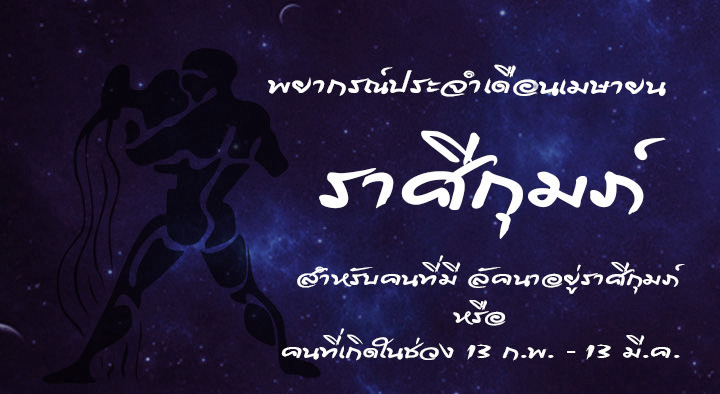 ชาวราศีกุมภ์ในช่วงเดือนที่ผ่านมาก็มีข่าวดีและความสำเร็จในเรื่องของการงานอย่างชัดเจน ด้วยดาวอังคารที่เป็นดาวการงานโคจรมีตำแหน่งเป็นเกษตร(มั่นคง)ที่ราศีเมษ ได้เจอช่องทางและงานใหม่ๆเช่นเดียวกัน สำหรับเดือนนี้ในช่วงวันที่ 13 เม.ย. ดาวอังคารที่เป็นดาวการงานจะโคจรเข้าสู่ราศีพฤษภมีตำแหน่งเป็นประเกษตร(อ่อนกำลัง) สำหรับคนที่ทำงานประจำจะมีทิศทางเบื่อเซง อยากย้ายงานเปลี่ยนงาน จะมีปัญหาหนักในช่วงวันที่ 18 เม.ย. ด้วยดาวเสาร์นั้นโคจรพักรกลับมาที่ราศีพิจิกเล็งกับดาวอังคารเป็นคู่ศัตรูกัน มีเกณฑ์ต้องระวังการแตกหักกับคนในที่ทำงาน หรือ ลาออกอย่างกะทันหัน ซึ่งแนะนำในมีสติและใจเย็นๆให้มาก คนที่มีธุรกิจอยู่อาจจะมีโปรเจคที่ได้ทำร่วมกับคนในครอบครัวโดยให้ครอบครัวมาเป็นตัวช่วยในธุรกิจหรือสนับสนุนการเงิน หรือ อยากเปลี่ยนงานมาทำอยู่กับบ้าน หรับการเงินต้องบอกว่าชาวราศีกุมภ์มีรายจ่ายสูงที่รออยู่รวมไปถึงได้มาออกไวเป็นเหมือนเงาตามตัวเช่นเดียวกัน ด้วยดาวพฤหัสบดีที่เป็นดาวการเงินโคจรพักรองศา และ เป็นมรณะแก่ดวงชะตา จึงส่งผลให้เป็นไปในลักษณะนี้ สำหรับความรัก คนโสดยังคงมีเกณฑ์พัวพันธ์กับคนมีเจ้าของแนะนำให้เอาเวลาไปทำอย่างอื่นดีกว่า ส่วนคนที่มีครอบครัวจะได้คู่มาช่วยเหลือในเรื่องของการเงินเป็นหลัก เรื่องน่าอึดอัดก็คงไม่พ้นเรื่องความสัมพันธ์ที่มีใครอีกคนเข้ามา อย่าทำอะไรที่มันผิดศีลข้อ 3 จะเป็นการดีที่จะไม่ทำให้เจอปัญหาที่แก้ไขไม่ได้บานปลาย