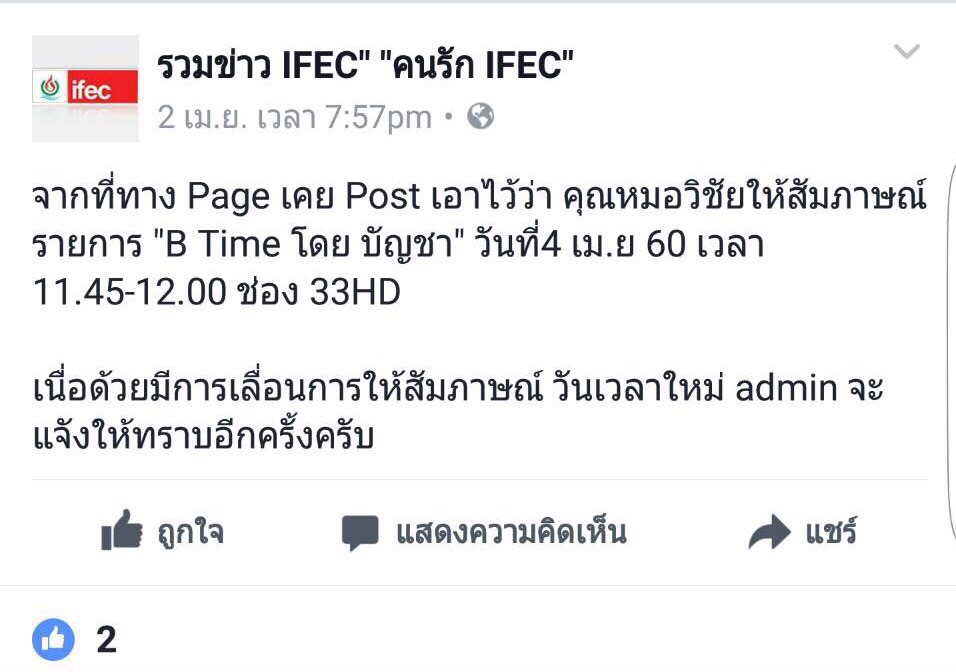 ไม่ได้เลื่อนแต่ยกเลิกไปเลย ในขณะที่เพจคนรักIFEC ยังเฉไฉชวนเชื่อดังนี้