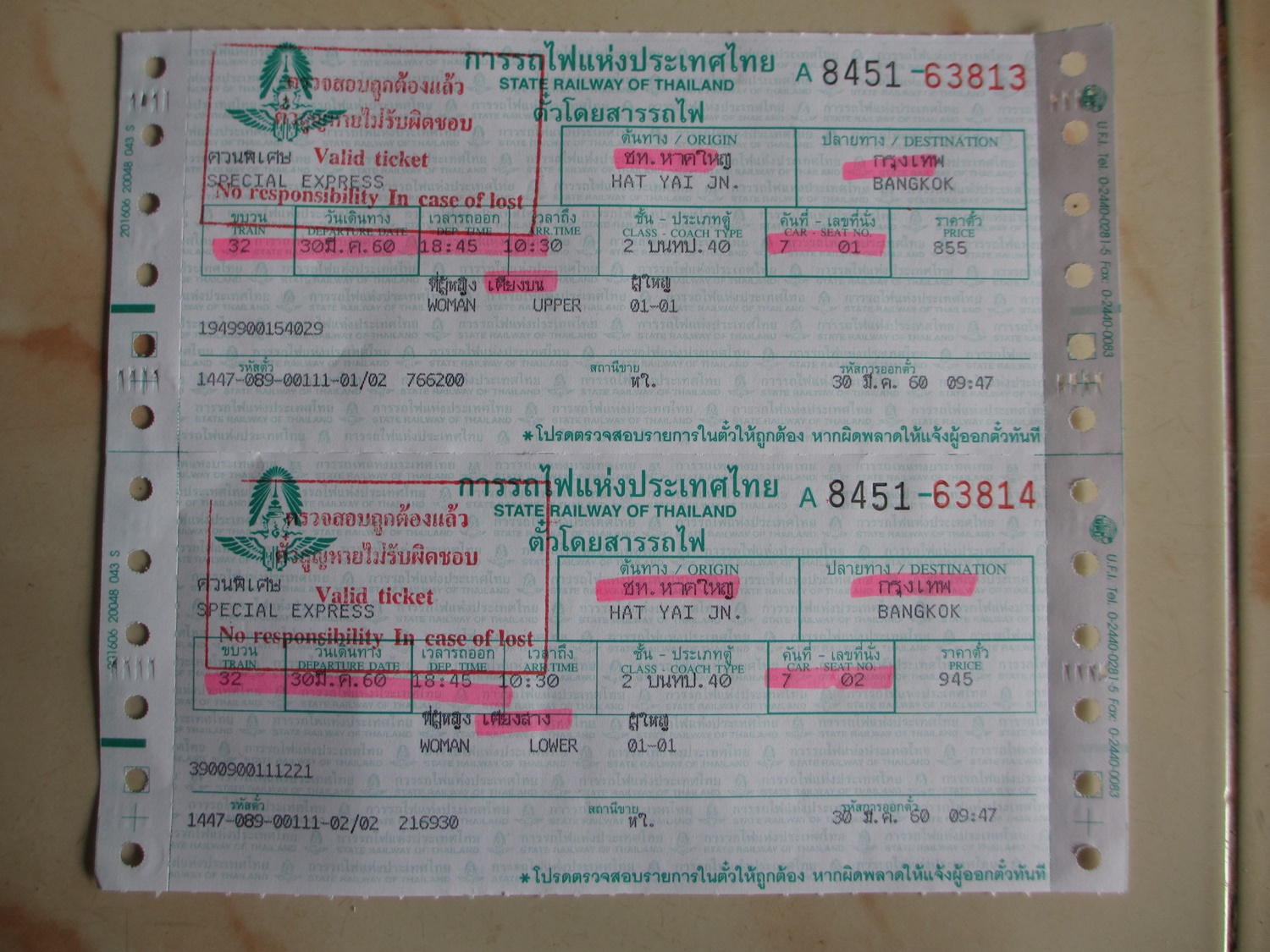 -ตั๋วเตียงชั้นบน ราคาอยู่ที่ 855฿ ส่วนเตียงชั้นล่างอยู่ที่945฿ เวลาการเดินทางคือ 18.45น.ถึงกรุงเทพฯ 10.30น.