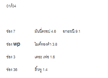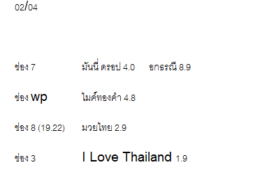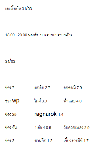 วันที่ 23 กุมภา CH3 - 1.443 CH7 - 1.357 ONE - 0.953 AMARIN TV - 0.729 THAIRATH TV - 0.709 WORKPOINT TV - 0.568 CH8 - 0.481 MONO 29 - 0.418 PPTV - 0.347 TRUE4U -