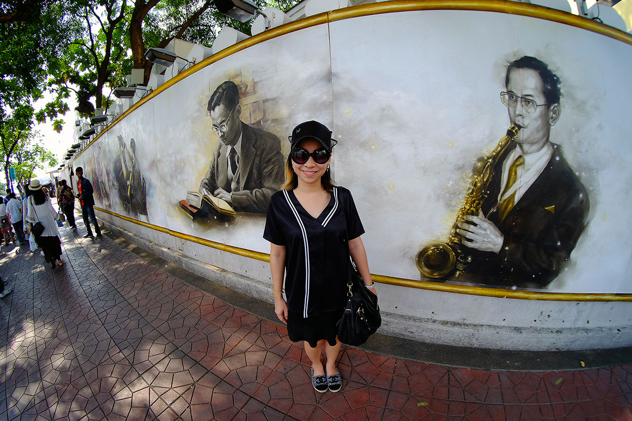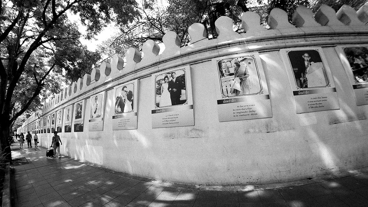แวะเที่ยววัดได้สักพัก เราก็ออกมาจากวัดแล้วเดินตามทางไปจนสุดหัวมุมก็เลี้ยวซ้ายผ่านด่านตรวจรักษาความปลอดภัย มาในส่วนหน้าของพระบรมมหาราชวัง แต่เราอยู่ตรงฝั่งทางมหาวิทยาลัยศิลปากร ตรงบริเวณนี้ก็มีภาพบรมสาทิสลักษณ์ของในหลวงภูมิพล ซึ่งเป็นผลงานของมหาวิทยาลัยศิลปากรประดับเรียงรายตลอดแนวรั้ว