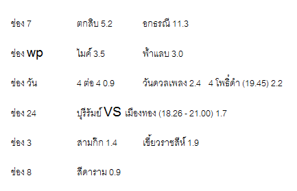 วันที่ 23 กุมภา CH3 - 1.443 CH7 - 1.357 ONE - 0.953 AMARIN TV - 0.729 THAIRATH TV - 0.709 WORKPOINT TV - 0.568 CH8 - 0.481 MONO 29 - 0.418 PPTV - 0.347 TRUE4U -