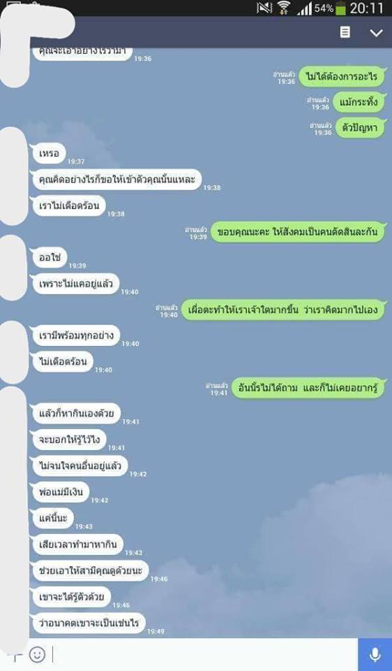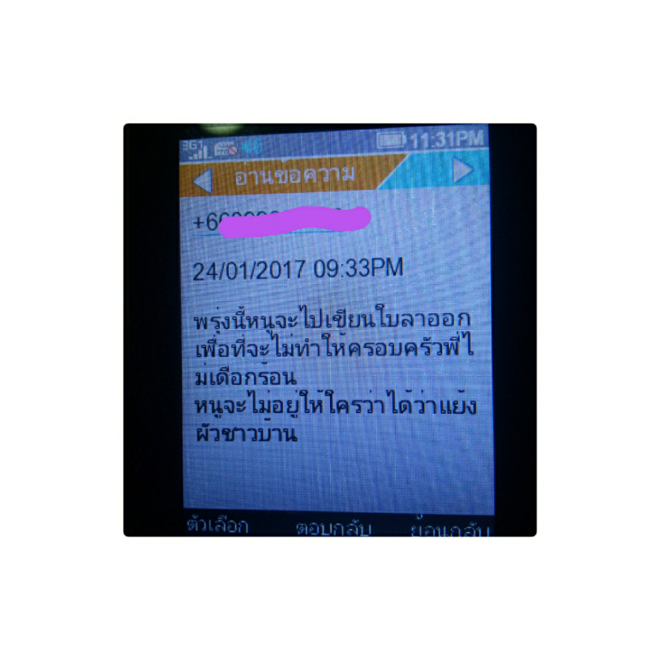 ตั้งแต่เราเจอข้อความ มึนไปหมด ถามสามี สามีก็บอกว่าไม่รู้ ส่งมาทำไม เบอร์ใครไม่รู้ มองไม่เห็น แต่ในมือถืออีกเครื่อง เมมเป็นชื่ออื่น ไม่ใช่ชื่อผู้หญิงคนนั้น แล้วก็รีบลบ SMS นี้ ออกทันที แต่เราได่ถ่ายเก็บไว้ ตอนนั้นก็ประมาณ 5 ทุ่มครึ่งกว่า 1 อาทิตย์เต็มๆ ที่เราไม่รู้จะทำยังไง เราไม่เคยโทรไป หรือคุยกับผู้หญิงคนนั้นเรื่อง SMS นั้นเลย แต่ทะเลาะกับสามีทุกวัน และเราก็ได้ส่งรูปถ่ายของ SMS ที่ถ่ายไว้ ไปให้ผู้หญิงคนนั้น ทั้งๆที่ เราไม่เคยคุยกับผู้หญิงคนนี้น เรื่องๆนี้ เลย แต่คำตอบที่ได้จากผู้หญิงคนนั้นยิ่งทำให้เราคาใจมากขึ้น