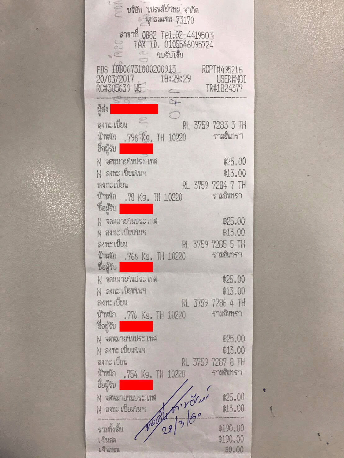 ก่อนอื่นขอเกริ่นก่อนว่าเราเป็นนักศึกษาที่กำลังขายของออนไลน์เราขายตุ๊กตาหมี คือเรื่องมีอยู่ว่าลูกค้ามาสั่งตุ๊กตาหมีเราทั้งหมด 10 ตัว เราอยู่นครปฐมลูกค้าอยู่กรุงเทพฯ ให้เราส่งไปรษณีย์ให้ (เราไม่มีกล่องใหญ่ จึงใส่กล่องเล็กไป 5 กล่อง กล่องละ 2 ตัว) เราก็ไปส่งของที่ไปรษณีย์พุทธมณฑลให้ เพราะอยู่ใกล้ (ส่งของวันที่ 20 มีนาคม) หลังจากนั้นผ่านไป 1 อาทิตย์ (วันที่ 28 มีนาคม) ลูกค้าไม่ได้ของ ลูกค้าบอกใช้ของไม่ทันแล้ว เลยมายกเลิกเรา เราเข้าใจก็เลยคืนเงินให้ลูกค้าไปแล้วเราก็ไปทำเรื่องให้ตีของกลับมาที่เรา