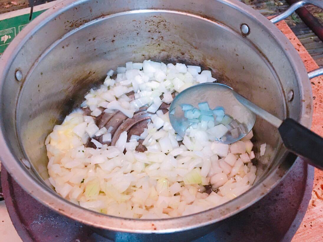 เริ่มจากผัดเนยกับหอมใหญ่ให้สุก คลุกเคล้าให้เข้ากัน