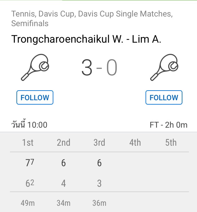 ผลการแข่งขัน เทนนิส เดวิสคัพ กรุ๊ปสอง เอเชีย/โอเชียเนีย รอบชิงชนะเลิศ วันแรก เป็นการแข่งขันเดี่ยวสลับมือ แข่งระบบสองในสามเซต คู่ที่1 วิชยา ตรงเจริญชัยกุล มือ 453 โลก แพ้ HABIB HADY มือ 643 โลก 6-4 6-