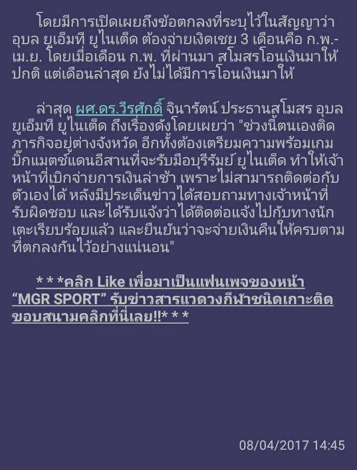 ดูเหมือนจะยังไม่จบไม่สิ้นสำหรับเรื่องฉาวของสโมสร “เทพอินทรี” อุบล ยูเอ็มที ยูไนเต็ด ทีมน้องใหม่ของไทยลีกฤดูกาล 2017 ที่มีเรื่องเป็นกระแสวิพากษ์วิจารณ์แทบจะรายวันเลยก็ว่าได้หลังจากที่ก่อนหน