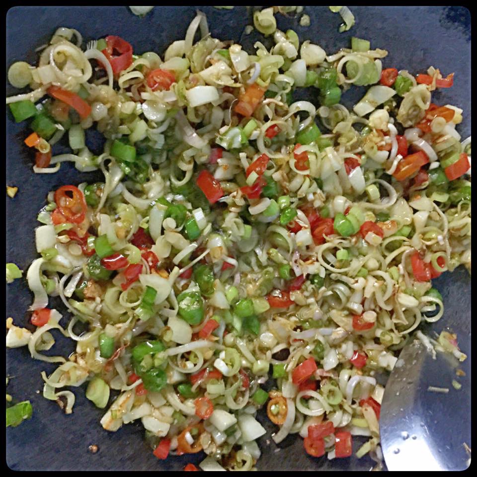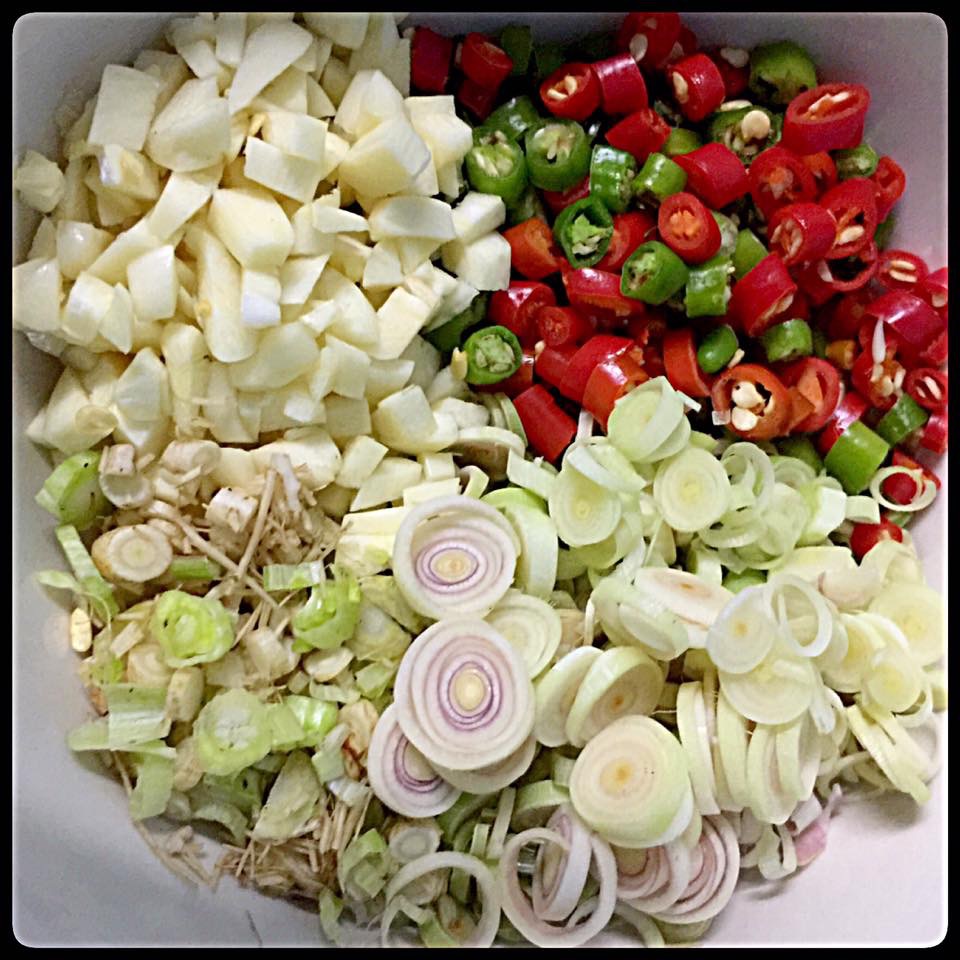 ตามด้วย ตะไคร้ซอย กระเทียมสับ พริกขี้หนูสวนซอย รากผักชีซอย