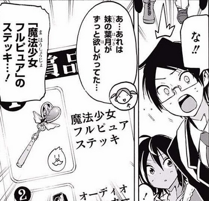 ยุอิกะเหลือบไปเห็นคฑาสาวน้อยเวทมนตร์ที่น้องสาวอยากได้บนใบปลิวที่พนักงานกำลังโฆษณาอยู่พอดี