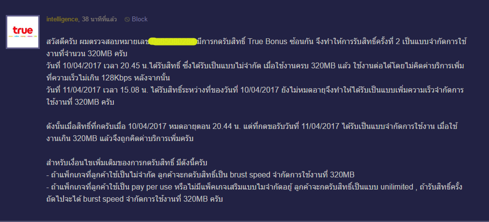 ซึ่งก็ไม่ได้พูดถึงเงื่อนไขตามที่คุณ intelligence แจ้ง ผมลองเข้าไปดูในแอพ TruYou ก็ไม่มีแจ้ง คือไม่มีหมายเหตุ ดอกจัน หรือตัวอักษรเล็กๆบอกเงื่อนไขกำกับอะไรไว้ตรงไหนเลย ผมจึงคิดว่าไม่แฟร์ที่ลูกค้าจะต้องมาเดือดร้อนจากสิ่งที่ True ไม่บอกให้รู้ หรือบอกไม่หมด หรือบอกไม่ชัดเจน เอาจริงๆง่ายที่สุดคือ True ควรจะแจ้งข้อจำกัดของการขอรับโบนัสอินเทอร์เน็ตครั้งที่ 2 ในช่วงที่ซ้อนกับเวลาที่ขอไปหนแรกผ่าน SMS ยืนยันสิทธิ์รับโบนัสของครั้งที่ 2 ให้ชัดเจนไปเลยว่าการใช้งานเน็ตครั้งนี้จะหมดเวลาตามกำหนดเดิมของการขอโบนัสเน็ตครั้งก่อนหน้า แต่นี่ SMS กลับแจ้งตามปกติและระบุกำหนดการหมดเวลาเป็นวันพรุ่งนี้ตามเดิม ทำให้ลูกค้าเข้าใจผิดว่าหมดเวลาตามนั้นจริงๆ มันไม่มีอะไรแจ้งเตือนลูกค้าเลย แล้วลูกค้าจะทราบได้อย่างไรว่าโบนัสเน็ตครั้งที่ 2 จะหมดเวลาตามกำหนดของการขอครั้งก่อน