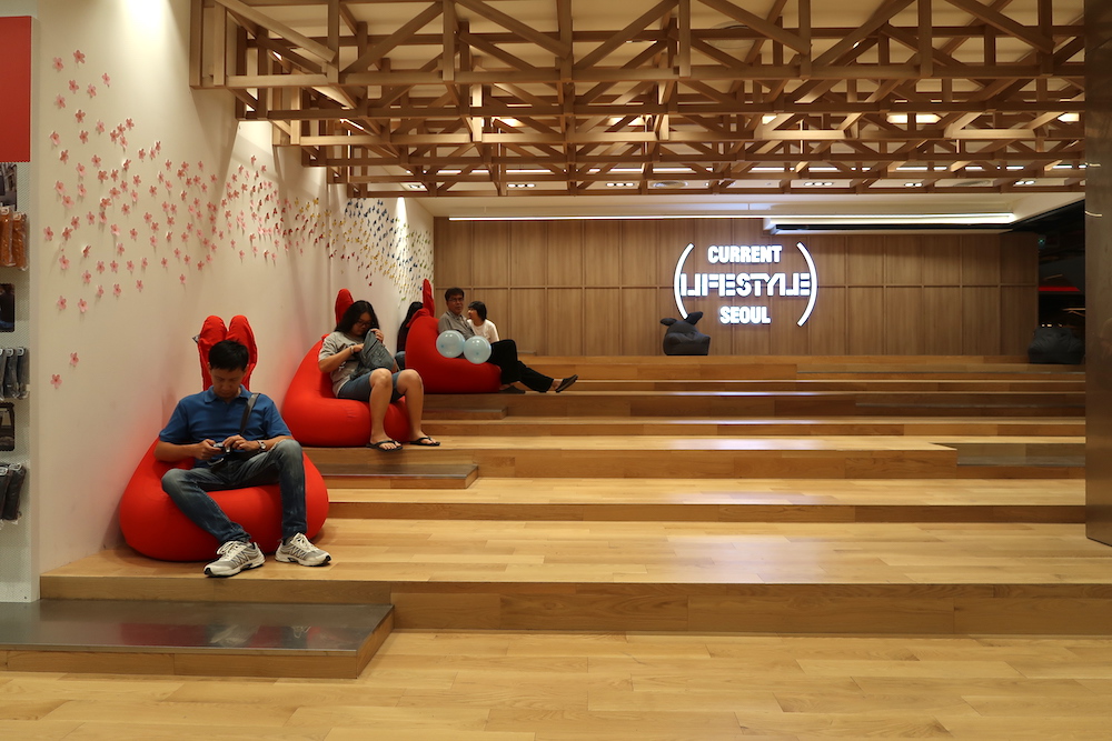 ชั้น 1: โซนอาหารเกาหลี หลากรูปแบบ ช้อปปิ้งของเกาหลี ทั้งซูเปอร์มาร์เก็ต ทั้งสกินแคร์และเครื่องสำอาง มีโซนให้นั่งเล่น