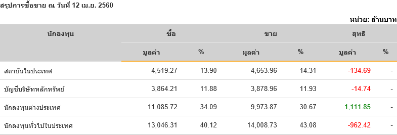 Sinthorn Summary 12/4/2560 : ต่างชาติซื้อสุทธิ 1,111.85 ลบ.