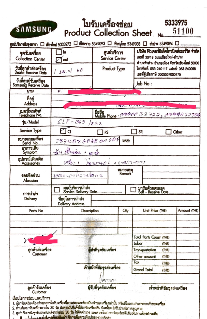 1 เมย 60 เอาปริ้นเตอร์ไปเคลม ปัญหาปริ้นแล้วสีเลอะ ที่ศูนย์ใหญ่เชียงใหม่ เจ้าหน้าที่ออกใบเคลมให้แล้วแจ้งว่าจะตรวจอาการติดต่อกลับใน 1-2 วัน