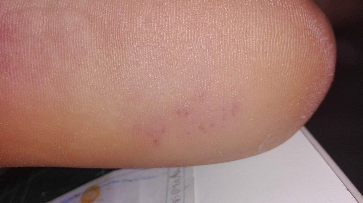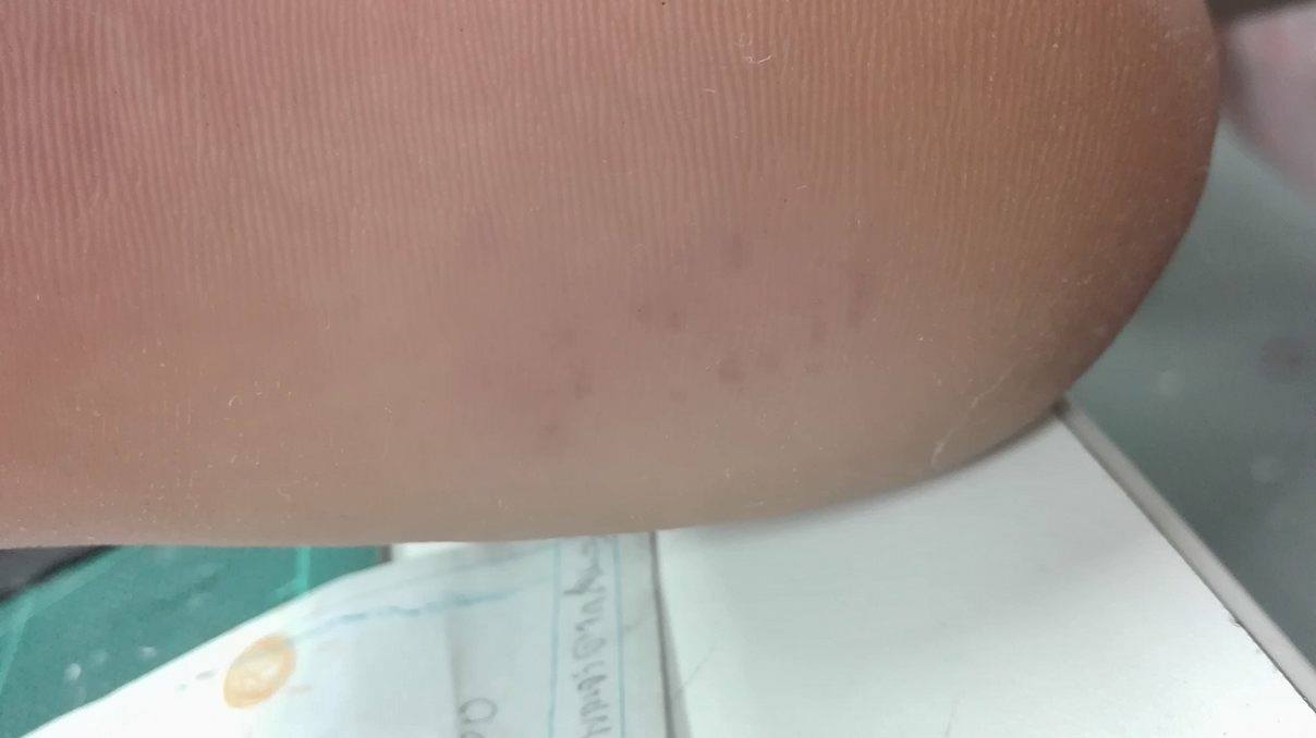 เป็นผื่นแดงที่ฝ่าเท้าค่ะ ไม่คัน เดินวิ่งไม่เจ็บ แต่ถ้ากดจะเจ็บ