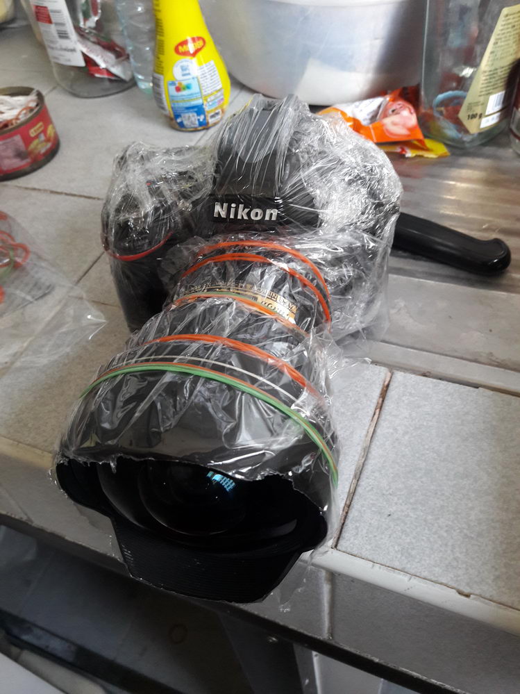 ผมใช้ถุงร้อน ห่อ รัดยาง เจาะรูหน้าเลนส์ ไม่เจาะไม่ได้ มัวมาก ยิ่งโดนน้ำยิ่งมัวครับ