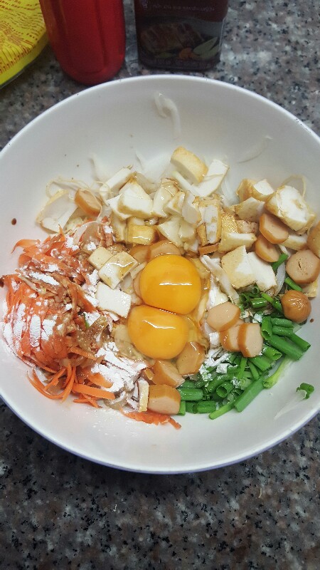 - ผสม แป้ง ไข่ น้ำเปล่า ซอสเทอริยากิ(นิดหน่อย) คนให้เข้ากัน ใส่ผักต่างๆ ไส้กรอก เนื้อสัตว์ลงไป