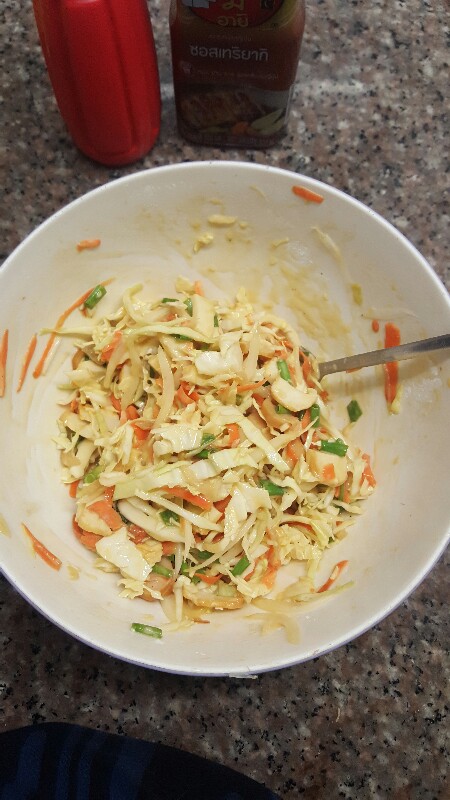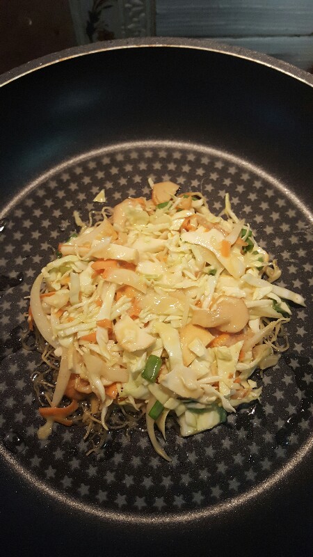 -ผักสด ได้แก่ กระหล่ำปลีซอย แครอทซอย หัวไชเท้า หอมใหญ่ ต้นหอม ( ถ้ามีมันฝรั่งให้ขูดเป็นเส้นใส่ด้วยก็ได้ค่ะ)
