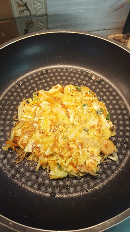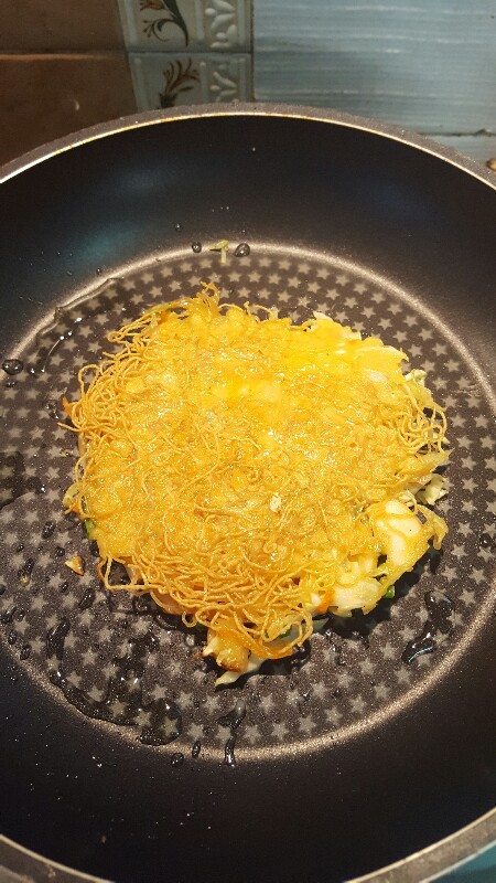 แล้วตักส่วนผสมของผัก ใส่ลงไปปิดทับเส้นบะหมี่ รอให้สุกเหลืองถึงกลับด้าน