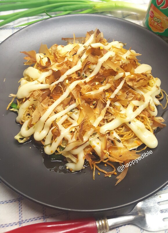 - สุกแล้วใส่จาน ทาซอสเทอริยากิ บีบเส้นสวยด้วยน้ำครีมสลัดหรือมายองเนส โรยหน้าด้วยปลาดอแห้ง แล้วสาหร่ายแผ่น