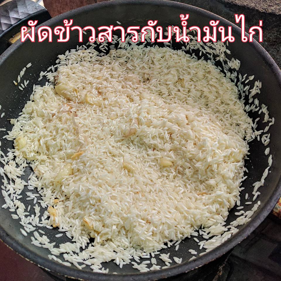 ผัดข้าวสารกับน้ำมันไก่ (น้ำมันไก่เจียวเสร็จใส่หอมแดงซอยเพื่อดับกลิ่นสาบไก่ เสร็จแล้วตักหอมเจียวทิ้งไป)