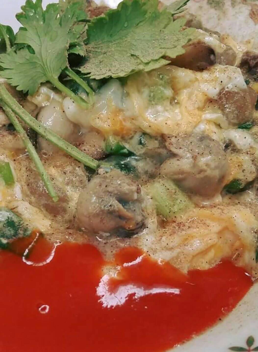หน้าตาคล้ายขนมถ้วยแต่ว่าตัวแป้งจะทำจากแป้งข้าวเจ้า (ลองชิมเปล่าๆมีรสชาติเค็มอ่อนๆ) ขนาด 1 ฝาใกล้เคียงกับ 1 ฝาขนมครก ซื้อมาในราคา 10 ฝา พร้อมเครื่อง 60 บาท ตอนซื้อแม่ค้าถามว่าให้นึ่งแป้งเลยไหมหรือจะไ