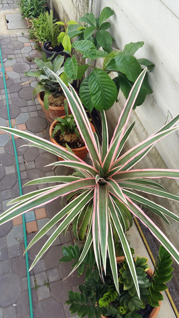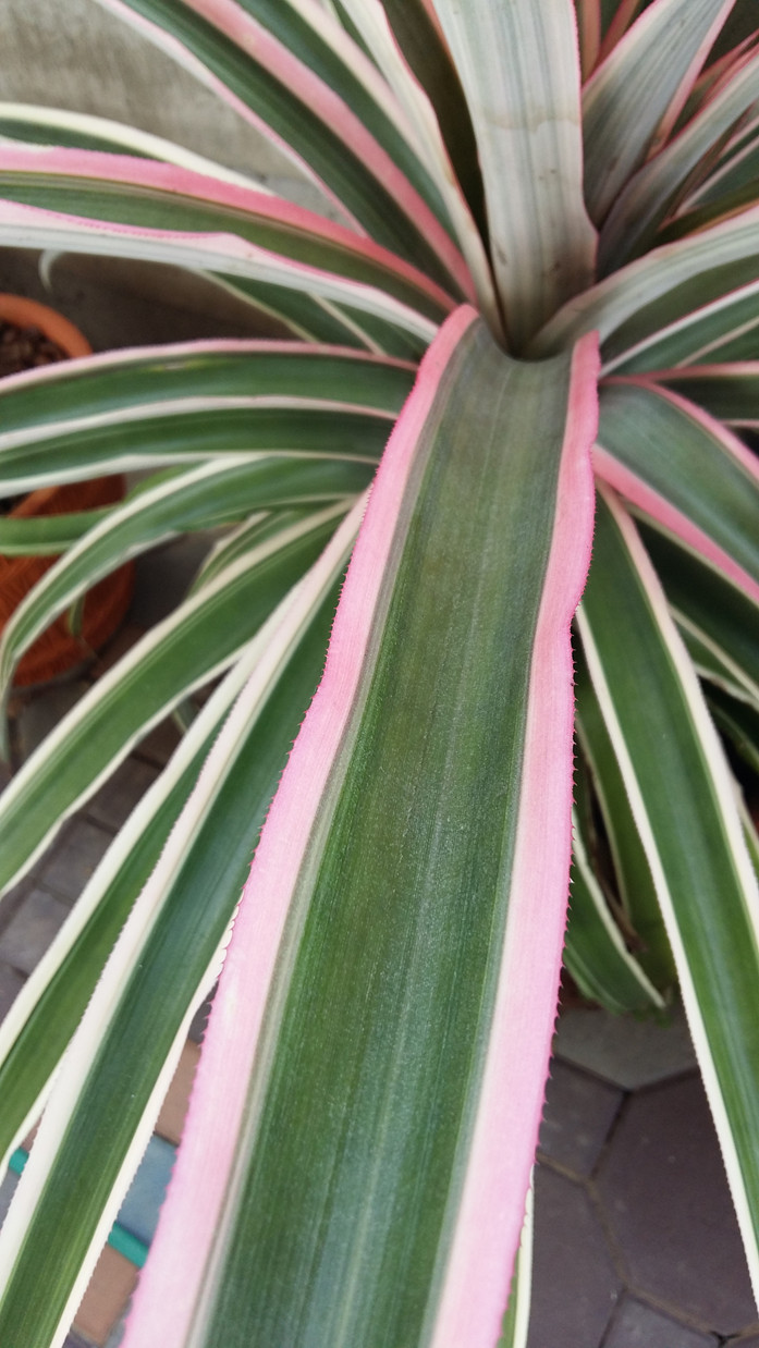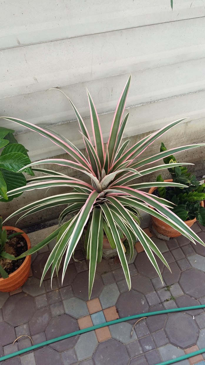 น่าจะเป็นสกุลAnanas นะคะ อาจจะเป็น Ananas bracteatus var.tricolour หรือสับปะรดแดง การปลูกเป็นไม้กระถางทำให้สามารถเคลื่อนย้ายไปตั้งตามที่ต่างๆได้สะดวก ทั้งยังควบคุมการให้น้ำและดูแลรักษาที่ง่ายกว่าปลูกลงดิน การจัดตั้งวางไว้ให้ได้รับแสงสว่างจากภายนอกพอสมควรโดยเฉพาะแดดช่วงเช้า ถ้าต้องการให้มีดอกก็ใส่ปุ๋ยสูตร 0-24-28 แต่โดยปกติจะออกดอกหน้าหน่ว ถ้าไม่ออกดอกเสียที อาจฉีดพ่นสารเอทิฟอน (Ethephon) ทุก 3 เดือน พร้อมให้ธาตุอาหารเสริมที่มีสังกะสี (Zinc)เป็นส่วนผสมในช่วงเย็นก็ได้ค่ะ