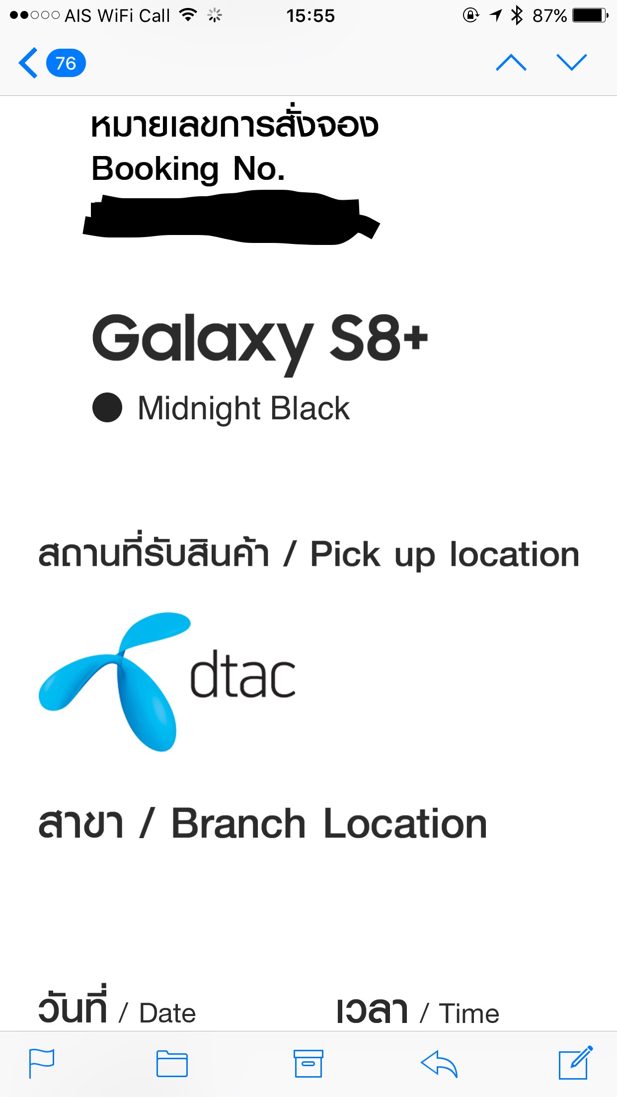 ได้ทำการจอง s8 กับ AIS ไป โดยเลือกแบบ ไปรับของ ที่ สาขา แล้วระบุ วัน เวลา แต่ email ที่ส่งมาให้ มีแค่รหัสการจองอย่างเดียว เหมือนกับว่าระบบลงให้ผิด เป็นแบบชำระผ่