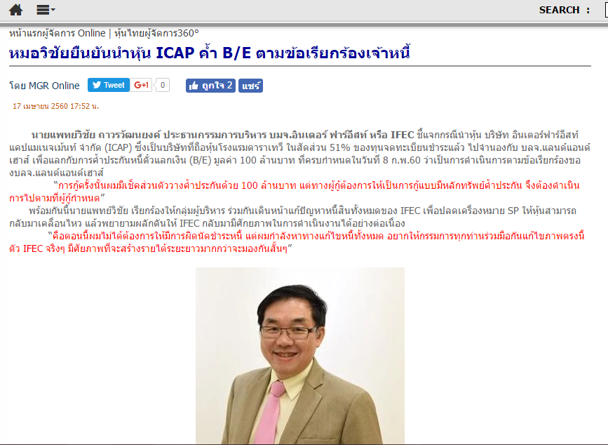นายแพทย์วิชัย ถาวรวัฒนยงค์ ประธานกรรมการบริหาร บมจ.อินเตอร์ ฟาร์อีสท์ หรือ IFEC ชี้แจกกรณีนำหุ้น บริษัท อินเตอร์ฟาร์อีสท์ แคปแมเนจเม้นท์ จำกัด (ICAP) ซึ่งเป็นบริษัทที่ถือหุ้นโรงแรมดาราเทวี ในสัดส่วน 51% ของทุนจดทะเบียนชำระแล้ว ไปจำนองกับ บลจ.แลนด์แอนด์เฮาส์ เพื่อแลกกับการค้ำประกันหนี้ตั๋วแลกเงิน (B/E) มูลค่า 100 ล้านบาท ที่ครบกำหนดในวันที่ 8 ก.พ.60 ว่าเป็นการดำเนินการตามข้อเรียกร้องของบลจ.แลนด์แอนด์เฮาส์