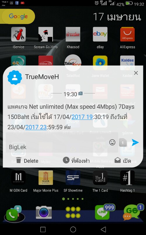 ทำรายการสมัครเน็ต 4 Mbps./ 7 วัน 150 บาท