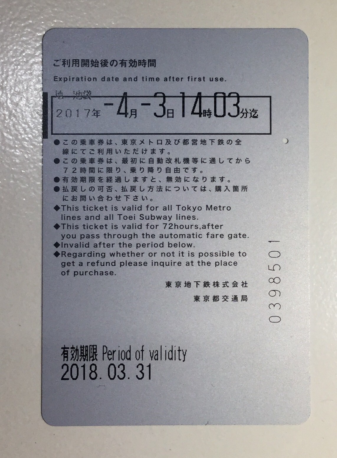 มันคือบัตร tokyo subway ครับผม มีให้เลือก 3 แบบ 1วัน 800 เยน, 2 วัน 1200 เยน, 3 วัน 1500 เยน นับเป็นชั่วโมงเลยครับ สมมติเราซื้อบัตร 1 วัน(24 ชั่วโมง) เราใช้วันนี้ตอน 13.00 น. บัตรก็จะหมดอายุวันพรุ่งนี้ 13.00 น. ครับ โดยวันหมดอายุจะแจ้งเตือนที่ด้านหลังบัตร ดังรูปครับ