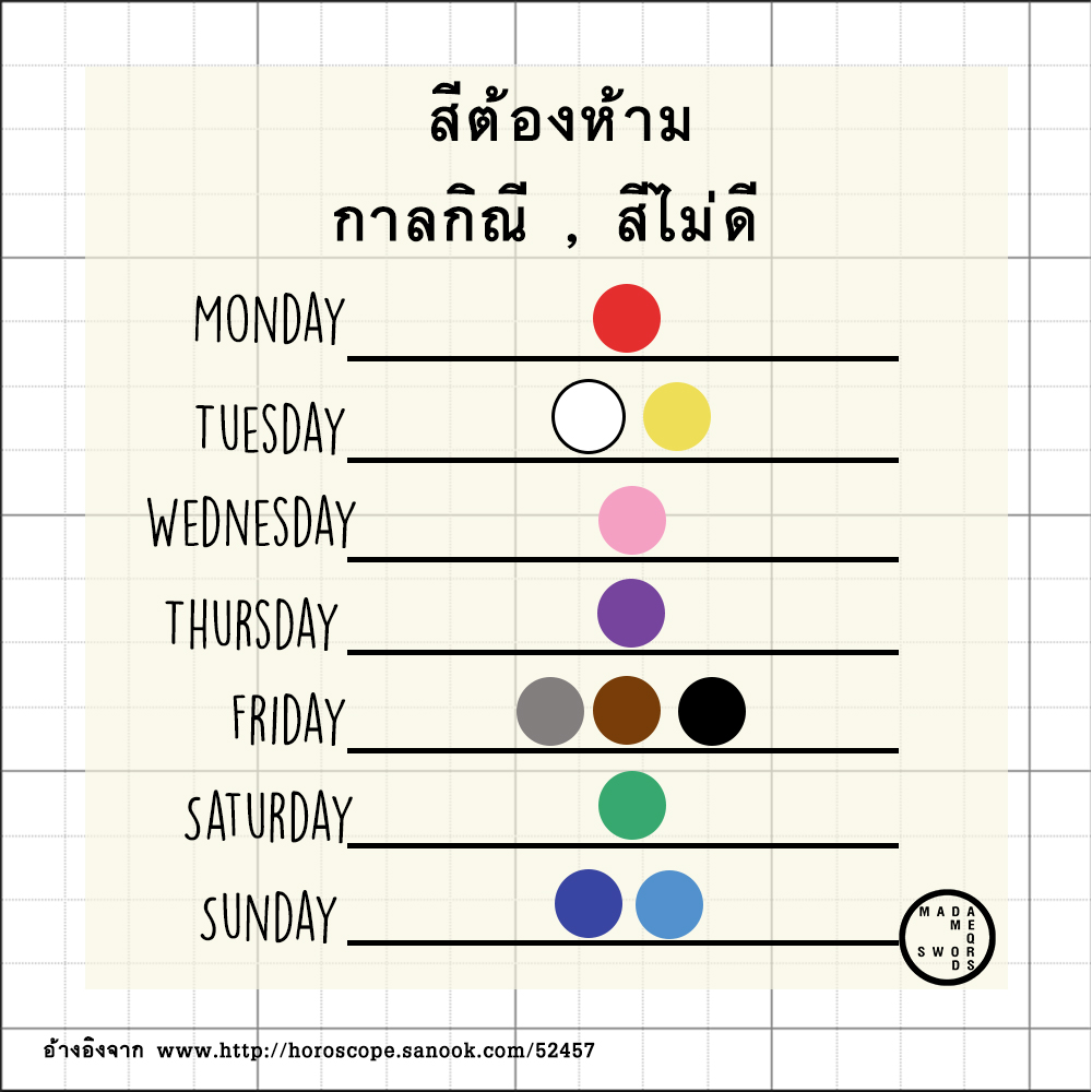 *เพิ่มสีไม่ควรสวมใส่ของแต่ละวันประจำสัปดาห์ ที่ไม่ถูกโฉลก ส่วนดวงสีอ่านตามวันเกิดได้เลยค่ะ