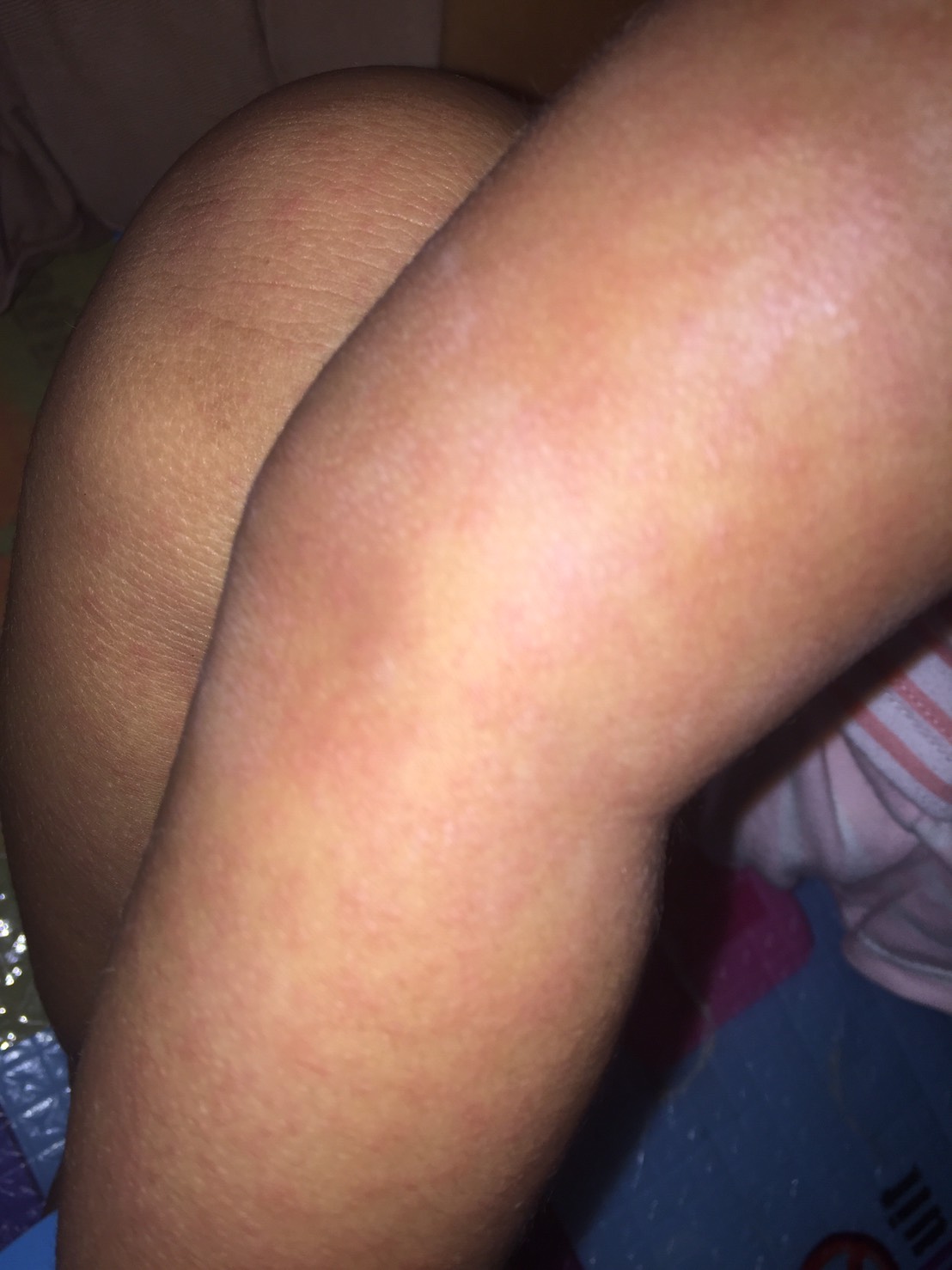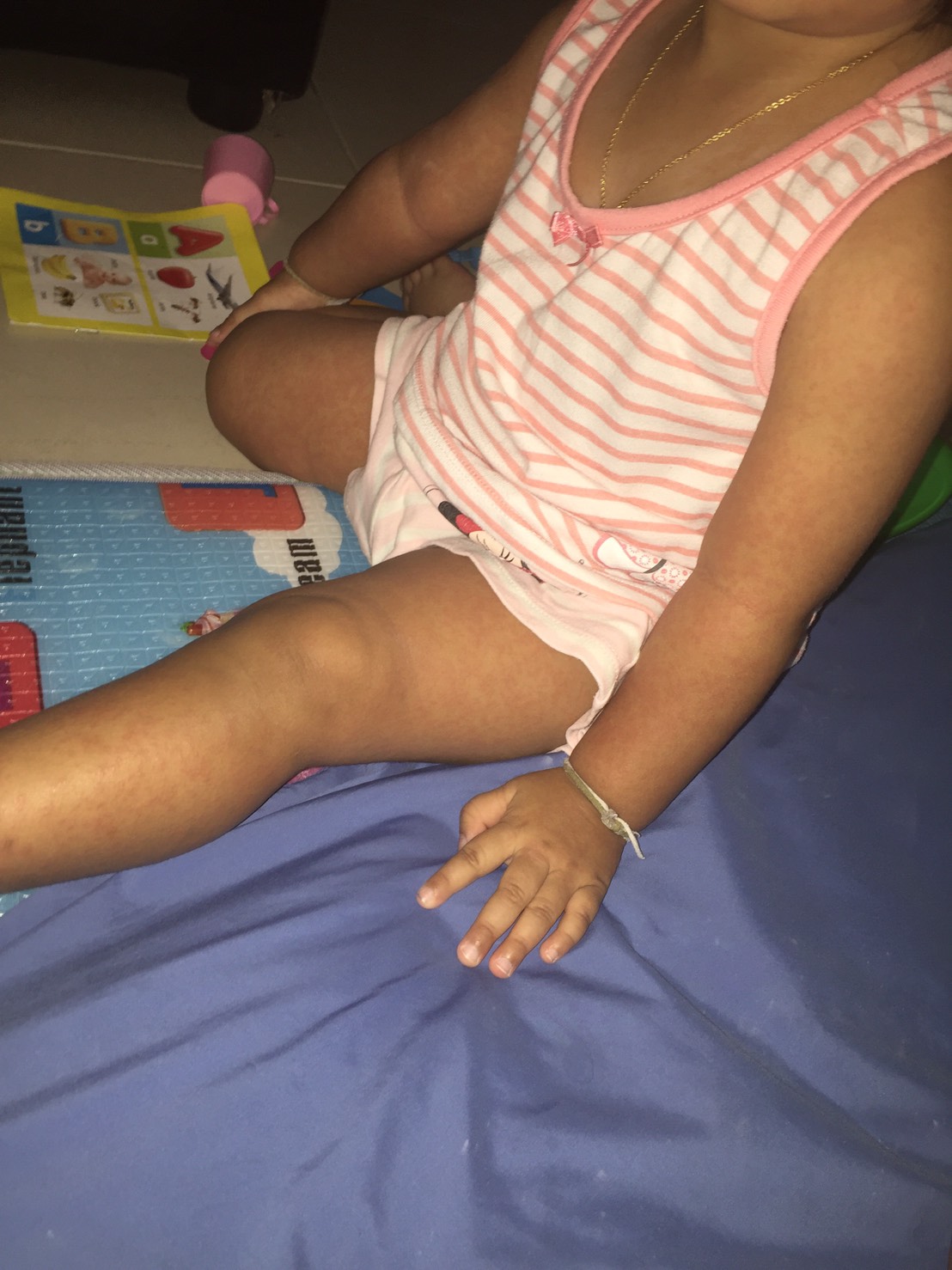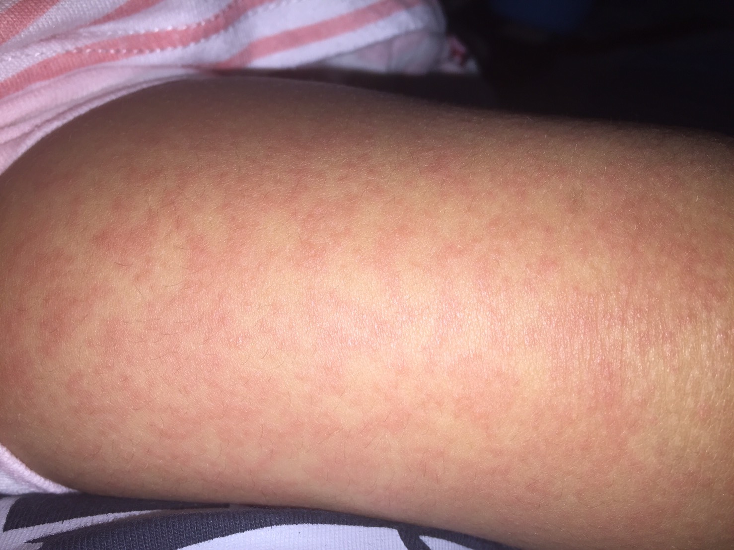 ลูกสาวอายุได้ 1 ปี 5 เดือน มีตุ่มแดงๆ เป็นปื๊ดๆ ขึ้นเมื่อวานจนถึงตอนนี้ยังไม่ยุบเลย ไม่รู้ว่าแพ้อะไร ขึ้นตามแขน ขา หน้าท้อง ที่หน้าไม่ขึ้น