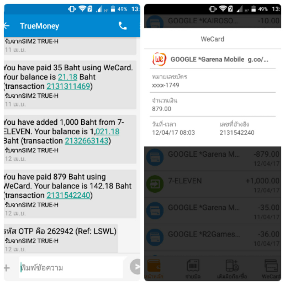 เช้าวันที่12/4/60 ผมไปเติมเงินเข้าแอพทรู วอเล็ต จำนวนเงิน1000บาท. "หวังจะเอามาเติมเกมเล่นแท้ๆ" เวลา8.03น. ผมทำการซื้อไอเทมเกมนึงราคา879บาท แต่มันทำรายการไม่สำเร็จสักพักมีข้อความเข้าจากทรู วอเล็ตว่าได้ทำการชำระเงินเรียบร้อยแล้ว879บาท!! ไอ้เราก็ งงมันทำรายการไม่สำเร็จไอเทมก็ไม่ได้เงินดันหักไปแล้ว ไม่มีประวัติการซื้อแอพในGoogle play ด้วยสิ ในใจคิดใว้ แล้วเราจะไปตามเรื่องกับใคร