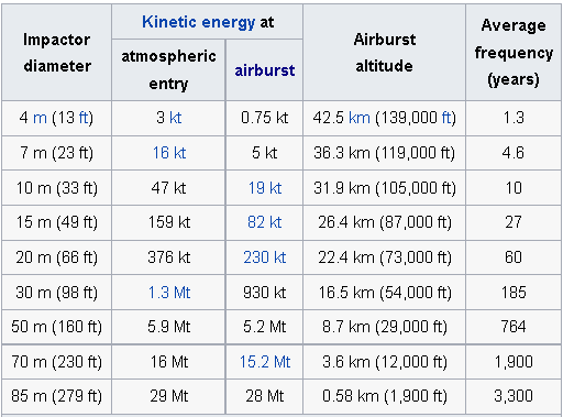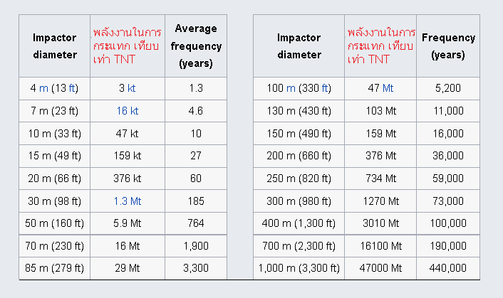 ตารางนี้แสดงถึงพลังงานของอุกกาบาตที่ผลิตออกมาได้ แสดงเป็นปริมาณเทียบเท่าดินระเบิด TNT