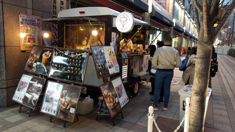 กินเครปร้านนี้ค่ะ เป็นเมนูแบบให้ใส่ตังค์กดเลือกเมนูเองอีกเหมือนกัน ซื้อเครปสลัดไก่ กะชาเย็น แปดร้อยเยนนะคะไม่เกิน